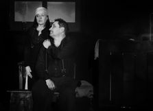 > original logo of most famous BG tavern from the socialistic period and documental photo of traditional BG wedding from the beginning of XXth century - both projected onto stage furniture